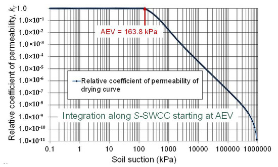 The permeability function remains at the saturated coefficient of permeability until the “true” air-entry value of the soil is reached. Integration along the S-SWCC commences at this point. The coefficient of permeability rapidly decreases as the soil desaturates. This is essentially the form that Brooks and Corey [26] proposed for the permeability function in 1964 and is similar to the Gardner function [27] proposed in 1958.