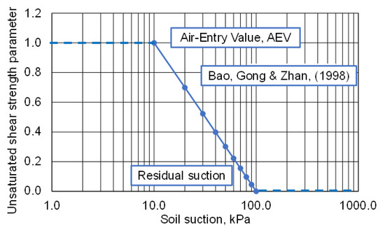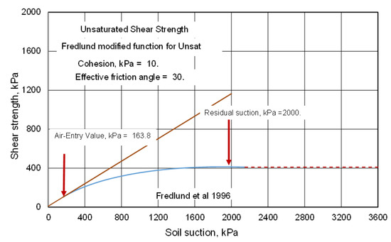 Ongoing research on the shear strength of unsaturated soils has brought to the fore two common observations. First, a soil behaves as a saturated soil in terms of the shear strength parameters, even when the pore-water pressures are negative, as long as the suction is lower than the air-entry value of the soil. Second, once the soil suction reaches a value near to the residual suction value, there is little further change in shear strength as the suction increases. These two anchor points can be defined in terms of the degree of saturation of the soil [31]. The type of function generated for the shear strength envelope is shown in Figure 22.