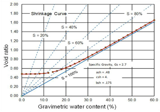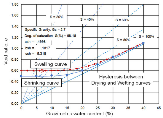 It should be noted that the shrinkage curve has been used to a lesser extent for the calculations of the volume change during the swelling process [32]. When this approach is used, it is necessary to assume there is no hysteresis between the drying and wetting processes (Figure 24). It should also be noted that, under these conditions, it is necessary to estimate the final gravimetric water content that might be attained upon swelling.
