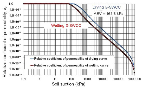 Relative coefficient of permeability curves corresponding to the drying and wetting S-SWCCs.