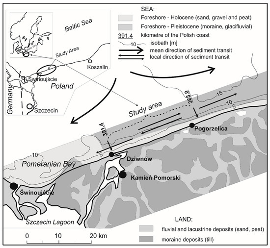 The Western Pomerania coastline of the Baltic Sea, Poland, which is characterized by presence of Pleistocene–Holocene glacial and fluvial deposits, shallow nearshore sediments, and divergence of sedimentary transport [37,42,43].