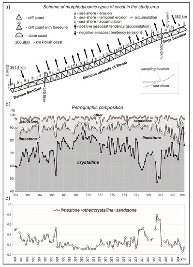 Coastal morphodynamics and petrographic composition of gravels between Pogorzelica and Dziwnów (363.0–391.4): (a) the seashore morphodynamics with erosion–accumulation tendencies, (b) the petrographic composition of beach gravels, and (c) the ratio between mechanically less resistant sedimentary rocks and more resistant gravels. The broken lines indicate a lack of gravel along the coast section investigated.