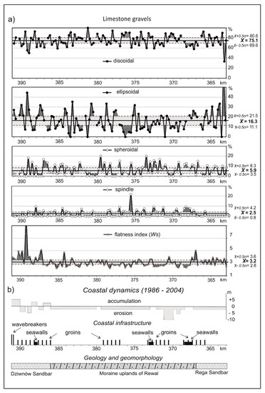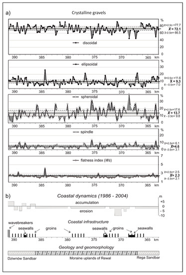 Finally, the data obtained were subjected to lithostatistical analysis. Considering the large number of collected and measured gravel samples (n = 17,882), the basic statistics (means, standard deviations, and percentages) were calculated with 90% confidence intervals. Calculated parameters (amount of gravels in selected petrographic groups, shape parameters, and Ws) were compared with coastal dynamics data (1986–2004) and presence of groins, wavebreakers, and seawalls [56,57].