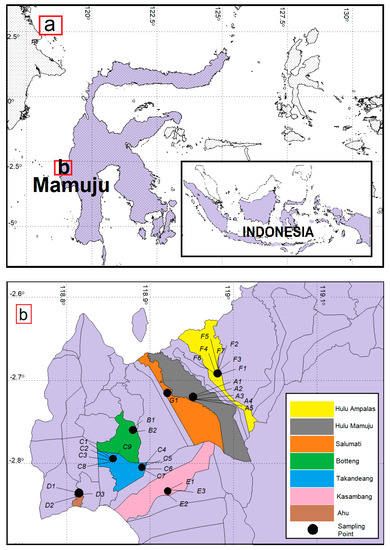 Study area: (a) Sulawesi Island and Mamuju area; (b) Mamuju subdistrict and sampling point.