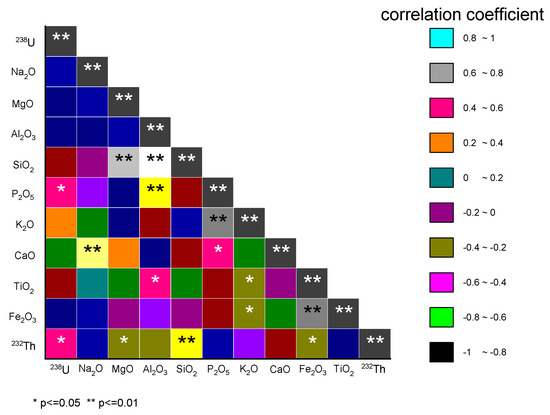 We used Origin Pro 2020b (student version) to evaluate significant relationships between the distribution coefficients of radionuclides and major elements and their oxide contents. We conducted a Pearson correlation analysis and calculated the values of Pearson correlation coefficients with a two-tailed significance test (p-value at 0.05 and 0.01). Equation (3) expresses the Pearson correlation coefficients [20].