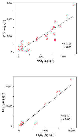 Correlation between ZrO2 and YPO4 concentrations and between Ce2O3 and La2O3 concentrations.