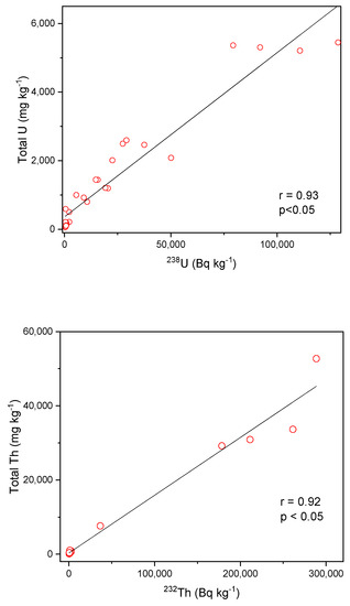 The results of HPGe analysis show that Mamuju rocks have a very high concentration of 238U and 232Th radionuclides. On the basis of the concept of secular equilibrium, concentrations of 238U and 226Ra are considered the same concentration between the parent and the progeny. We created a comparison chart of 238U activity concentrations using an HPGe detector and for total U using XRF analysis (Figure 5). This method was also used to compare 232Th and total Th. Correlation analysis was conducted using Pearson correlation. The p-value was less than 0.05 (two-tailed) and, thus, it was categorised as having a significant correlation. The correlation coefficient values of the U and Th variables were 0.93 and 0.92, respectively, which shows that both methods have a strong positive correlation. This graph shows that there is a uniformity between the 238U results of HPGe analysed from the energy peak 214Pb and 214Bi and the concentration of total U measured by XRF and between the 232Th results of HPGe analysed from the energy peak 212Pb, 208Tl, and 228Ac and the concentration of total Th measured by XRF.