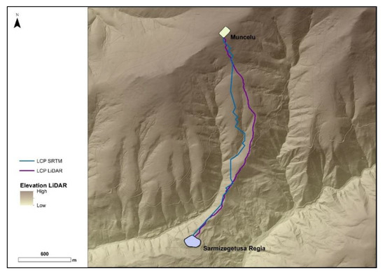 Least-Cost Paths (LCP) from Sarmizegetusa Regia to Muncelu calculated from LiDAR and SRTM DTMs.