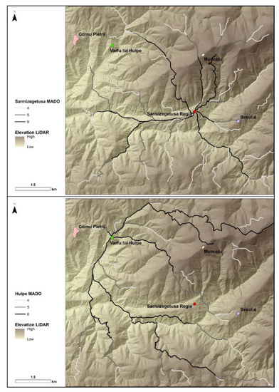 In a siege scenario, a key requirement for the attacking troops is to cut the target’s connections with the outside world. MADO analyses show that, while at Vârfu lui Hulpe no Roman camp hinders any major communication route—thus raising doubts as to whether the hillfort saw any substantial siege at all—at Sarmizegetusa Regia both Roman bases nearby (on Muncelu and Şesului hills) are affecting circulation along main access routes towards north and southeast (Figure 4). Indeed, the northern communication route is cut at Muncelu by two parallel east-west oriented ramparts which seem to precede the permanent fortification and whose function has not been clarified before [17]. Similarly, given the morphological structure and spatial extent of Sarmizegetusa Regia itself rendering less relevant LCP analyses, MADO analyses from Şesului hill and from Muncelu hill successfully highlighted the most efficient routes for their attackers to reach various locations across the site, and the most exposed areas to attack.