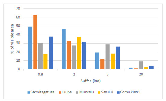 In uplands, an elevated position may increase one’s ability to see around a given position, but does not guarantee it. Viewshed calculations are now the standard method to digitally estimate the ability of individuals to see the landscape around them from a given location [38,39]. Binary viewsheds were obtained (using the Viewshed tool in ArcGIS 10.7.1) to assess the effectiveness of visual control from specific sites across the surrounding landscape using OFFSETA (observer height) of 6 m corresponding to the estimated mean height of the Dacian citadel walls and of 2.8 m for the Roman military camps (considering 1.2 m for the height of the rampart and 1.6 m for an average height of the human being). The viewsheds were calculated from several points uniformly distributed within the perimeter of the hillforts and the Roman bases. These were subsequently divided and quantified by different buffers (0.8, 2, 5, and 20 km), to account for short, medium and long visual distances. In addition, total viewsheds (using the Viewshed tool in ArcGIS 10.7.1, with input points in every cell of the LiDAR-derived DTM) and cumulative viewsheds (using the Visibility tool in ArcGIS 10.7.1) were also calculated to assess the visual prominence of sites within the wider landscape and their visual interconnections [39,40,41]. Though vegetation is known to be a major influencing factor in visibility calculations [42], we decided not to factor it in our model as the vegetation at the time should have been relatively sparse given the density of wood-based Iron Age architecture and the industrial scale of metallurgy in the area and documented warfare practices [15,43]. Future work will focus on the fuzziness and direction of viewsheds, in order to assess probability and intentionality of visibility [44,45,46,47,48].