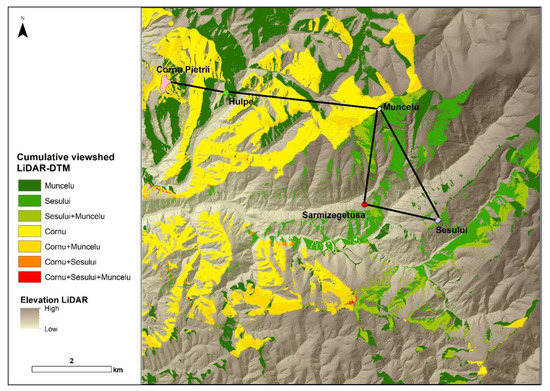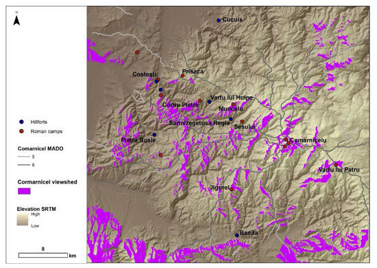 From the three Roman bases closest to Sarmizegetusa Regia, the one with most visual prominence and in higher command over the wider surrounding landscape was at Muncelu hill (Figure 6, Figure 7 and Figure 8). This connected visually with both Şesului and Cornu Pietrii camps and more distant army bases, and Dacian hillforts such as Vârfu lui Hulpe and, further away Piatra Roşie. Surprisingly, it covers very poorly Sarmizegetusa Regia, its likely siege target, and the main approach to it. This is compensated however by the -otherwise more localised- coverage from Şesului hill, and therefore, their visual complementarity could indicate that they had acted as a tandem (Figure 8). The overall visibility from Cornu Pietrii is also fairly limited and, while allowing communication with Muncelu, Costeşti Blidaru, Comărnicelu and Jigurel, it fails to cover the Vârfu lui Hulpe hillfort—a significant inconvenience if warfare was to be conducted from Cornu Pietrii against Vârfu lui Hulpe.