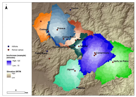 Previously employed in ‘predictive’ and ‘postdictive’ approaches [55], LCP analysis is considered an intuitive method to reconstruct the layout of (ancient) roads or paths [56,57,58] or to identify the rationale behind the construction of routes [59,60,61]. In contrast, our case study deals with paths that do not have a physical materialization in the landscape. Therefore, we aimed to identify the main natural routes across the mountains between the Roman military sites (considered a priori as attackers) and the Dacian hillforts (a priori designated as targets), where contemporaneity may not have been yet proven. Previous attempts to move beyond simple LCP calculations between starting point A and a destination (or target) point B, have been attempted through ‘cumulative cost paths’ [62] or through FETE (‘from everywhere to everywhere’) [63,64], to create “travel probability surfaces” akin to dense circulatory systems or road networks [63].