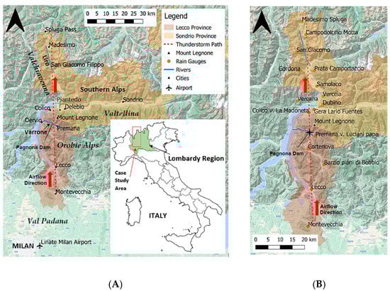 (A) The case study area in the Lecco and Sondrio Provinces (Lombardy Region, Italy) with affected municipalities and infrastructures; (B) the local rain gauges network from Arpa Lombardia with the south-north airflow direction along the thunderstorm path (dotted red line).