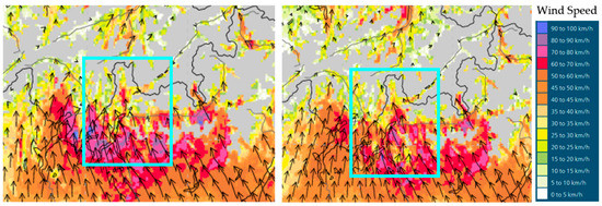 Low-level wind convergence (blue boxes) recorded in the study area at 2000 m, © Meteo Swiss [45], during the night of 12 June at 3:00 and 4:00.