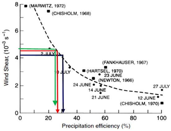 Precipitation efficiency as a function of the wind shear, modified after [48].