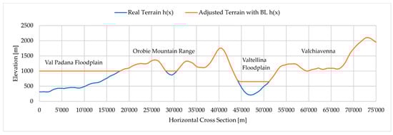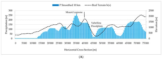 The BL was included in the LUM formulation proposing a new elevation profile that can differ significantly from the real terrain. In particular, the areas settled under the BL height were automatically flattened because they were assumed to be excluded from rainfall formation processes. Figure 6 shows the comparison between the real terrain profile and the adjusted one considering BL. A reference value of boundary layer of 1000 m was adopted for the Val Padana side, and an indicative value of 600 m was used for the Valtellina floodplain. The latter was decreased considering the possibility that local valley winds are responsible for its rapid depletion [31,52,55].