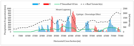 In Figure 7, the spatial evolution of P (blue) and E (red) cumulated over 13 h are reported. Comparing the graph with the elevation profile, it could be highlighted that LUM works in accordance with the physics of the orographic rainfall mechanism that led to precipitation formation in the windward portion of the mountain (upslope) and the evaporation in the lee side (downslope). This is particularly evident for Mount Legnone, which is the highest peak of the entire cross section (1500 m smoothed and 2650 m effective).