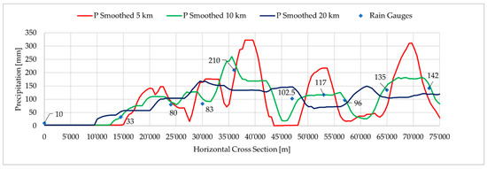 The LUM results of P(x) and E(x) appear to be physically correct; however, we noticed that the rainfall amounts were under/overestimated at certain points and rather irregularly distributed. Therefore, to obtain a realistic representation of the rainfall pattern, a smoothing function was applied to P(x). We tested three different smoothing windows related to the meso-gamma scale of the studied phenomena: 5, 10, and 20 km ranges, as reported in Figure 8. We considered a smoothing window of 10 km that better fit the observed values. This also led us to believe that 10 km was the length scale of the thunderstorms that occurred in the region during the event [5,32,53]. The green continuous line in Figure 7 and Figure 8 represents the smoothed function for the precipitation P(x): the values of the rainfall field are now more uniformly distributed with respect to the initial prediction (Figure 7). The results have already considered the reduction ratio related to the precipitation efficiency (0.3).