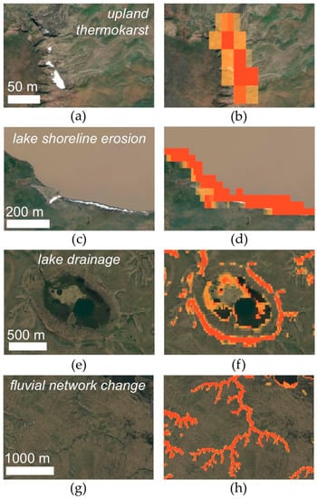 Examples of types of land surface change in the Yamal-Gydan region that were detected by the change detection algorithm (CDA): upland thermokarst (a) with change pixels (b); lake shoreline erosion (c,d); lake drainage (e,f); and fluvial network change (g,h). Satellite imagery in the left and right columns are identical. Imagery in the right column includes colored pixels from the CDA. Imagery © 2020, DigitalGlobe.