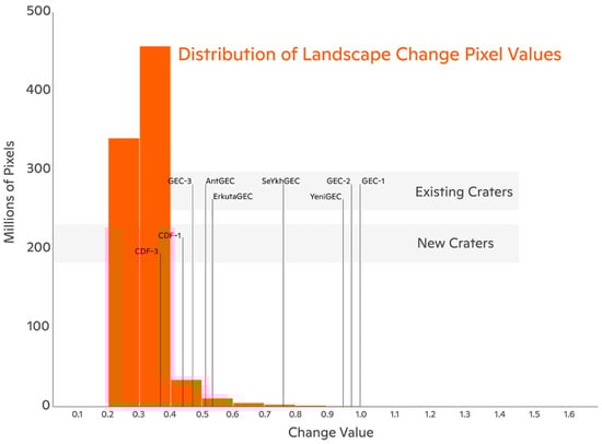 Locations of gas emission craters (GEC) and change detection features (CDF) identified by the change detection algorithm (CDA). Magnitude of landscape change was derived from the change pixels (see Section 2.2).