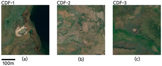 Three GEC-like change detection features (CDF) identified using the change detection algorithm: CDF-1 (a), CDF-2 (b), and CDF-3 (c). Imagery © 2020, DigitalGlobe