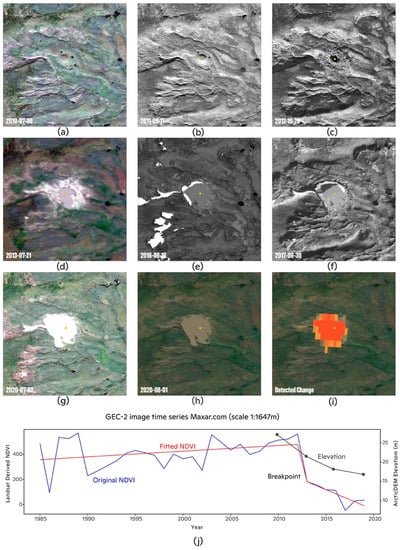 Time-series of high-resolution satellite imagery showing the development of GEC-2 from July 2010 (top left image) to August 2020 (bottom center image). Image series shows the mound predecessor (a,b) prior to GEC formation (c), and subsequent lake formation and expansion (d–h). Image on the bottom right shows a cluster of change pixels superimposed on the lake formed by GEC-2 (i). Chart at the bottom (j) shows the original trends and fitted trends (by LandTrendr) in Landsat-derived NDVI (scaled from −1000 to 1000), the breakpoint identified by LandTrendr, and corresponding trends in elevation extracted from the corrected ArcticDEM strips. Imagery © 2020, DigitalGlobe.