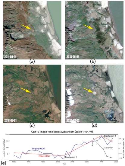 Time-series of high-resolution satellite imagery showing the development of CDF-2 from September 2011 (top left image) to July 2020 (bottom right image). Image series shows the mound predecessor (a), mound degradation (b), crater formation (c), and subsequent lake expansion (d). Graphs at the bottom (e) show the original trends and fitted trends (by LandTrendr) in Landsat-derived NDVI (left) (scaled from −1000 to 1000), breakpoints identified by LandTrendr, and trends in elevation (right; 2014–2017) extracted from the corrected ArcticDEM strips. Imagery © 2020, DigitalGlobe.