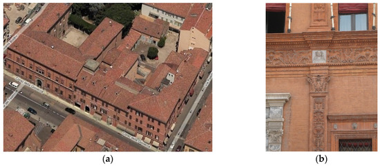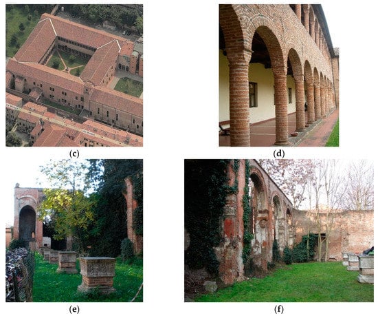 • two historical buildings in the center of Ferrara, dating back to around 1500 and located in the area called Addizione Erculea: Palazzo Roverella (Figure 2a,b) and the cloister of the monastery of Santa Maria delle Grazie (Figure 2c,d);