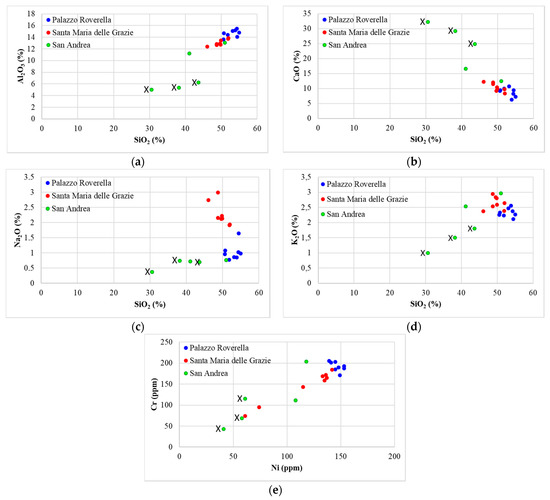 The binary diagrams related to the alkalis (Na2O-SiO2 in Figure 4c and K2O-SiO2 in Figure 4d) show that the samples from the cloister of Santa Maria delle Grazie were generally more enriched in sodium oxide than those of Palazzo Roverella, which, on the other hand, were potassium-rich. The high values of sodium oxide (between 1.92 and 2.99%) in Santa Maria delle Grazie were probably due to the use of Na-rich flux. In contrast, high values of potassium oxide in the samples of Palazzo Roverella could indicate the use of a K-rich flux. In addition, the samples collected in San Andrea showed a similar weight percentage of Na2O to each other, but a different weight percentage of K2O (the bricks were more enriched in K2O with respect to the plaster).