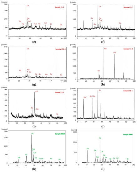 The diffractograms of the samples collected in the cloister of Santa Maria delle Grazie are shown in Figure 5e–j. In detail, Figure 5e–g illustrate the XRPD results of the samples of cotto, cotto degraded and mortar, respectively, characterized by a similar pattern in which quartz was the major mineralogical phase followed by feldspar and calcite. On the other hand, Figure 5h–j illustrate the degradation phenomena: saline efflorescence (Figure 5h) with high peaks of halite followed by quartz, and black crusts (Figure 5i,j). The presence of gypsum in the samples C6-1 (sulfated black crust) probably could be related to a high value of sulfur [41]. The façade of the cloister of Santa Maria delle Grazie overlooks a narrow and busy street, this could be one of the reasons to better understand the presence of black crusts in the samples collected on the cloister façade [42,43,44].