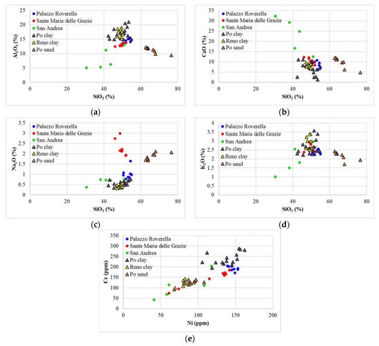 In the binary diagram Al2O3-SiO2 of Figure 7a, the collected samples from Palazzo Roverella and Santa Maria delle Grazie were grouped in a small area of the graph represented by high weight percentage of Al2O3 as for the clay samples, both from the Reno river and the Po river. The samples of both historical buildings showed a lower weight percentage of aluminum oxide than that of the local clays, while the samples from the church of San Andrea appeared different with respect to the two clays analyzed, with a lower weight percentage of silica oxide and aluminum oxide. Only the two bricks from San Andrea appeared similar in aluminum oxide concentration to the sand of the Po river.