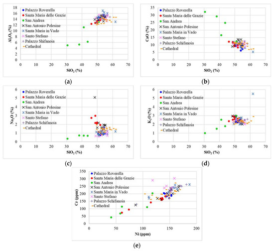 In detail, in the binary diagram Al2O3-SiO2 (Figure 4a), the collected samples of Palazzo Roverella and Santa Maria delle Grazie and the two samples of San Andrea relating to the bricks were grouped in a small area on the right top of the graph with a weight percentage of Al2O3 between 11 and 15, while the two plaster samples showed a very low weight percentage of Al2O3 around 5 and 6.