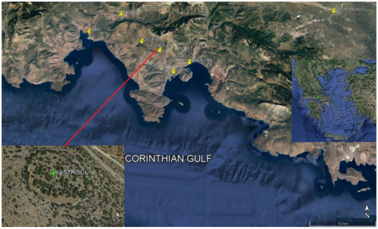 The Late Mycenaean (Late Helladic III) settlement of Kastrouli is located about 3 km east of Desfina and southeast of one of the most important sanctuaries of Greek antiquity Delphi (Figure 1). The archaeological site of Kastrouli was discovered by Dasios [1] and Raptopoulos [2] continued with the rescue excavation and cleaning of three Mycenaean graves unearthed therein. The systematic investigation of the site was the focus of a new Project started in 2016 by the University of the Aegean and the University of California San Diego [3,4] and with subsequent excavation in 2017 and 2018 [5,6]. The Mycenaean site of Kastrouli is located on a 700 m height hill having a strategic position for controlling the Mesokampos plateau and is certainly related to other coeval settlements in the vicinity. Throughout centuries, the Kastrouli fort was a checking point controlling the communication between the two important harbors of Itea and Antikyra and possibly a seaport at Steno [7,8]. Recently it has been identified as the Homeric site of Anemoreia in Homer’s Catalogue of Ships (Iliad, 2.521). Although the site is not discussed more by Homer with its heroes, Schedius and Epistrophus, remaining among the most obscure [7,9].