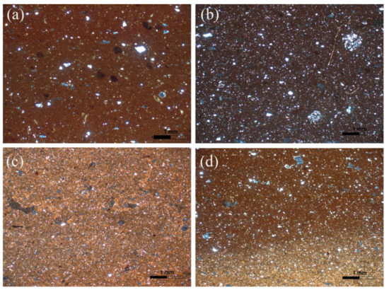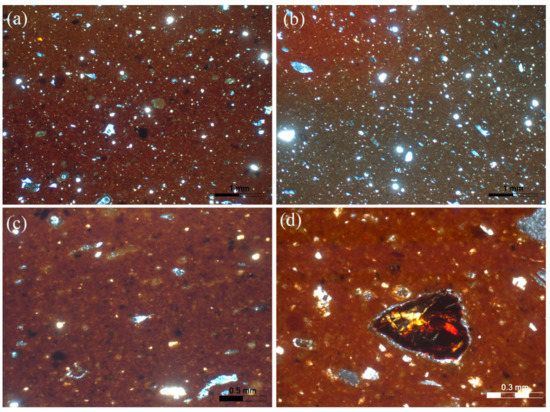 The fifth fabric group consists of six samples (K2, K12, K27, K85, K95 and K124), which has as main characteristic feature the micaceous clay matrix. The grain size reaches up to the coarse silt size class (<0.05 mm). The micromass interference color ranges from reddish brown to yellowish brown and is moderately optically active (Figure 7a–d). White mica is the dominant mineral, whereas brown mica is fewer and monocrystalline quartz is common. Samples K2 and K95 contain few decomposed micrite grains, whereas sample K12 has few coarse sandstone fragments with cement rich in iron oxides. Plagioclase and epidote were only rarely noticed.