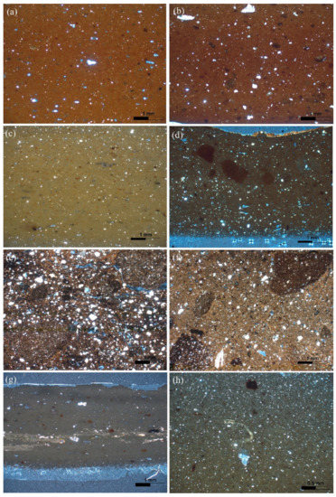 Sample K19 is characterized as a very fine fabric with a striated b-fabric. The micromass has an olive interference color and is optically inactive (Figure 8g). Silt sized quartz and white and brown mica are rarely encountered. Iron-rich argillaceous inclusions with diffuse boundaries have also been observed.