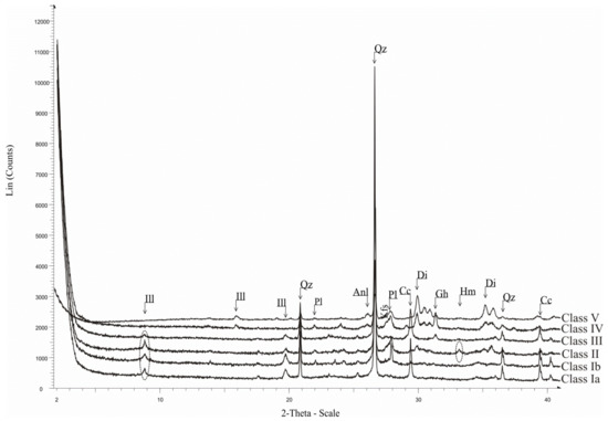 The first class (I) includes twelve samples and is further subdivided in two sub-classes (Ia and Ib) due to the presence or absence (or trace contents) of calcite in class Ia, which suggests a different composition (Figure 9). Subclass Ia encompasses only two samples and is represented by the mineralogical assemblage quartz + calcite + illite + plagioclase (all assemblages are given in diminishing order of mineral presence). Subclass Ib includes ten samples and has the mineralogical assemblage quartz + illite + plagioclase ± calcite ± k-feldspar ± hematite.