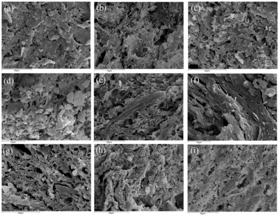 The first group includes thirteen samples and is characterized as calcareous (CaO > 6 wt. %). Seven samples (K7, K9, K20, K21, K84, K85 and K112) from the calcareous group show a collapse of clay minerals shape due to the process of the dehydroxylation (Figure 10a–f). This in turn favors the development of sintering as the particles join together, occasionally forming smooth areas and filaments indicative of initial vitrification stage. These features indicate a relatively high temperature of firing and specifically around 850–950 °C. This is in accordance to the firing temperatures estimated through XRPD, except for samples K84 and K112. The microtexture of these later samples suggests a higher temperature than that recorded for the rest ones falling in this group, without however exceeding 900–1100 °C. Extensive vitrification and the formation of fine bloating pores are common in samples K18, K23, K24, K51, K85 and K95 (Figure 10g–i) of the same group. In calcareous ceramic samples these structures usually indicate a firing temperature in the range of 900–1100 °C [26]. However, the presence of illite in samples K51 and K95 indicates that the temperature did not exceed 950 °C.