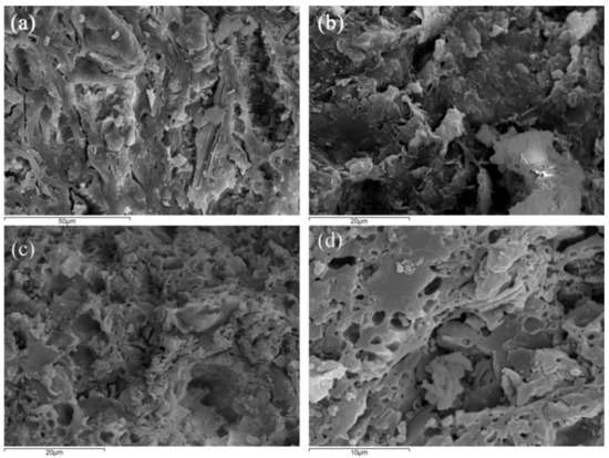 Secondary electron micrographs of fresh fractures from representative samples of the low calcareous ceramic samples (representative samples): (a) K4, (b) K6, (c) K22 and (d) K70.
