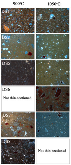 Petrographic description of the experimental briquettes was performed in order to be compared texturally and compositionally with the ancient ceramics and to determine the provenance of their raw materials. At 900 °C the clay minerals sinter and adhere together contributing to the reduction of the optical activity. The dominant constituents are monocrystalline quartz and fragments of mudstone and siltstone, whilst brown mica still persists in sample DS1 (Figure 12). The micromass is optically inactive and its interference color tends to be darker and ranges from yellowish brown and olive brown to dark olive. In higher temperature (1050 °C), the sintering is extensive and the remained inclusions are quartz and brown mica. The photomicrograph of sample DS7 fired at 1050 °C shows the “calcite ghost”, which is deposited in the edges of the pores. The interference color of the micromass is getting darker and is olive, brownish olive and grayish olive. In comparison with the ancient ceramics, it is worth noting the presence and preservation of brown mica as well as the participation of the mudstone fragments, which offer evidence for the local provenance of some of the studied ancient ceramics.