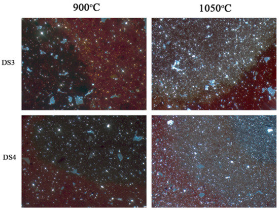 The samples DS3 and DS4 are described individually due to the formation of the core and margins and the absence of the carbonate components. The interference color of micromass at 900 °C is dark olive in the core and dark red at the margins, whereas at 1050 °C it changes to light olive in the core and red at the margins. In relation with the ceramic sherds, two samples (K22 and K16) have been characterized as non-calcareous, and in addition both are distinguished for the development of “sandwich microtexture” (Figure 13).
