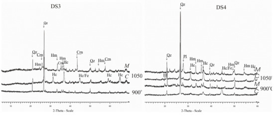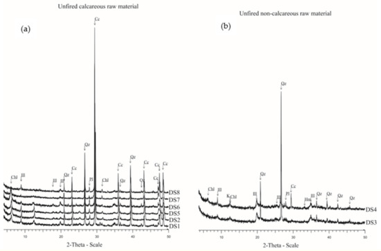 The mineralogy of the unfired clayey sediments as well as the fired samples was determined using X-ray Powder Diffraction (XRPD). All the samples (DS1, DS2, DS5, DS6, DS7 and DS8) apart from two are characterized as calcareous and have as main mineralogical assemblage quartz + calcite + plagioclase + illite + chlorite (Figure 14a). The samples DS3 and DS4 contain very low quantities of calcite and have the mineralogical assemblage quartz + plagioclase + illite + chlorite ± kaolinite ± hematite (Figure 14b).