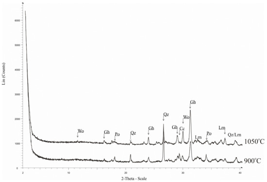 Class II is represented by two samples that are characterized by the mineralogical assemblage quartz + calcite + illite + plagioclase + gehlenite and is differentiated from class I because of the gehlenite presence. The presence of the basal reflection (001) of illite in the diffractogram (Figure 9) indicates that the firing temperature did not exceed ~850–950 °C, which is further confirmed by the gehlenite presence.