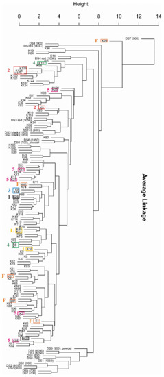 Dendrogram (average linkage agglomerative hierarchical clustering) of chemical analyses presented in Liritzis et al. (2020a). Clustering is based upon the chemical results presented in Liritzis et al., 2020a, in order to be coherent and facilitate distribution of present groupings). Rectangles represent petrographic groups: black—group 1; red—group 2; blue—group 3; green—group 4; magenta—group 5; orange—fine fabric; yellow—loners.