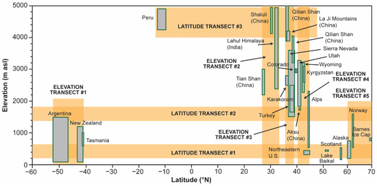 We use single and bi-variate linear models, Monte Carlo simulations, and analysis of variance (ANOVA) tests to determine if variations in the measured 26Al/10Be concentration ratios in our compilation are correlated with elevation and/or latitude. We first divide the sample population into three latitude transects and five elevation transects to isolate latitude and elevation as variables and create sample groups for ANOVA testing. Each elevation transect is a bin of samples from similar latitudes but spanning a range of elevations, while each latitude transect is a bin of samples with similar elevations but varying latitudes (Figure 1).