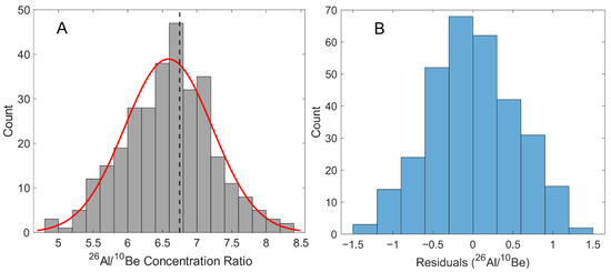 (A) Histogram and normal distribution approximation of 26Al/10Be concentration ratios in the compilation analyzed here. Dashed vertical line shows the currently accepted production ratio value of 6.75. (B) Residuals of bi-variate regression model predicting 26Al/10Be variations due to elevation and latitude.