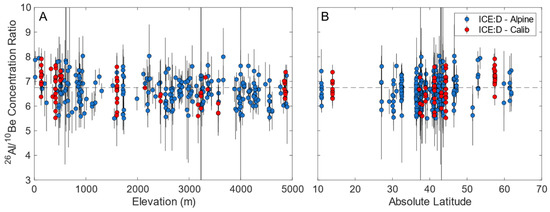 Measured 26Al/10Be concentration ratios plotted against elevation (A) and latitude (B). Dashed horizontal line shows the currently accepted production ratio value of 6.75. Samples from the ICE:D—Alpine database are colored blue, samples from ICE:D—Calib are red.