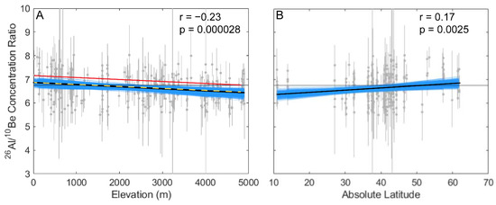 The following are available online at https://www.mdpi.com/article/10.3390/geosciences11100402/s1, Extended methods and results, Figures S1–S10 and Table S1. Figure S1: Distribution of 26Al/10Be concentration ratios from the initial ICE:D query. Vertical dashed line marks a ratio of 6.75. Figure S2: Distribution of concentration ratio uncertainties (%) from the initial ICE:D query. Figure S3: Standard boxplot of concentration ratio uncertainties from the initial ICE:D query. Box limits are the 25th and 75th percentile values, center red line is the median, whiskers are the high and low values not considered outliers, red crosses show outliers. Figure S4: Linear regressions (central lines) and 95% confidence intervals (upper and lower lines) for elevation and latitude transects. Note: 95% confidence interval lines for latitude band 2 are outside the y-axis bounds. Figure S5: Model check for normality in bi-variate linear regression correlating the measured 26Al/10Be concentration ratios to elevation and latitude. X-axis shows fitted values (ratios) from this model, while y-axis shows the measured ratios. Blue line is the 1:1 reference line. Figure S6: Model check for homoscedasticity in the bi-variate regression model. X-axis is fitted ratio values from the model, y-axis is residuals of the model compared to the data. No clear pattern in residuals is observed, indicating homoscedasticity. Figure S7: Model check for normality in LSDn scaling model against the measured 26Al/10Be concentration ratios. Axes are same as in Figure S4, but x-axis now shows fitted ratio values from LSDn scaling. Figure S8: Model check for homoscedasticity in the LSDn scaling model compared to concentration ratio data. Axes are same as in Figure S5, but x-axis shows fitted values from the LSDn scaling model. Figure S9: Comparison of the bi-variate linear model from this study (bottom, gray) and the LSDn scaling model (top, multi-colored) against the data in this compilation (blue dots). The decrease in concentration ratio with increasing elevation is nearly identical between the two models, but the LSDn model shows a more pronounced increase in ratio with latitude. Figure S10: Exploration of the influence of sample collection year on measured ratios and ratio uncertainties. Table S1: the statistics table for the bivariate regression run without UW samples.