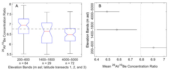ANOVA tests indicate that there is a statistically significant difference in measured 26Al/10Be ratios between samples from the highest and lowest elevations. Both the mean and median 26Al/10Be concentration ratio from latitude transects 1 (200 to 600 m asl) and 3 (4000 to 5000 m asl) are significantly different (p = 4.96 × 10−5; Figure 5). Moreover, the ratio differences are as predicted by nuclear physics models, with the lower elevations having a higher 26Al/10Be ratio (mean ± SE = 6.80 ± 0.12, median = 6.95) than higher elevations (mean = 6.49 ± 0.11, median = 6.48, Figure 5). The mean and median 26Al/10Be concentration ratio from latitude transect 2, covering the 1400 to 1800 m asl elevation band, is different than latitude transect 1 at the 5%, but not 1%, significance level (p = 0.025) and is not significantly different than latitude transect 3 (Figure 5).