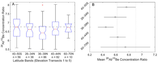 (A) Boxplots from ANOVA testing of latitude transects. Each boxplot shows the median (central red line), 25th and 75th percentile values (bottom and top edges of box), and max/min values that are not considered outliers (whiskers). The notches in each box represent median comparison intervals; two boxes with notches that do not overlap have medians that are different at the 5% significance level. For more information see [52]. (B) Multiple comparison of means from ANOVA testing. Each circle is the mean 26Al/10Be concentration ratio from the latitude transects. The line extending horizontally out from this point is the standard error of the mean. Vertical line is superimposed to illustrate the difference between groups.