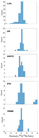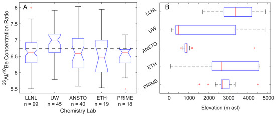 The higher ratios observed in samples processed at UW do not skew our interpretation of elevation and latitude influences on the 26Al/10Be production ratio, and we attribute the higher ratios partially to differences in the elevation of samples processed in these two labs. To assess the leverage of the higher-ratio UW samples, we created a bi-variate regression model with these samples removed and found no significant difference in our results. Both the elevation/ratio correlation and the model itself were still statistically significant, although the elevation/ratio correlation was not as robust as when the UW samples are included (p = 0.02 vs. p = 0.004; Table S1). Samples processed at UW are from low elevations, with more than 50% from below 500 m asl, while the only lab with significantly different ratios, LLNL, has samples from predominantly high elevation locations (Figure 7B). The negative correlation between elevation and 26Al/10Be ratios demonstrated here and predicted by Lifton et al. [20] could thus be partially responsible for the observed difference between UW and LLNL results.